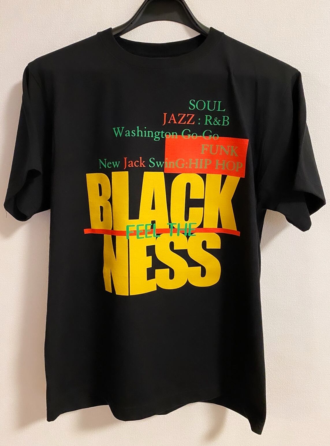 カラー Tシャツ:黒 / 文字:胸 マスタード、レッド、グリーン3色